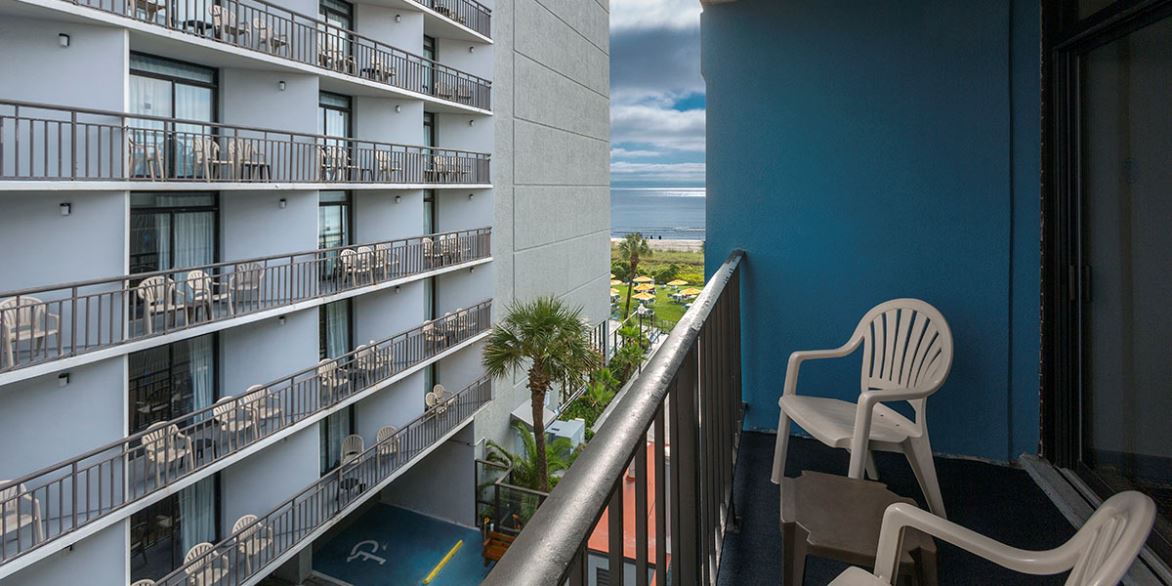 Located in the Middle Building. Main room features (2) queen beds, microwave, mini fridge, dining table with chairs, TV, bathroom with standing shower only, and private balcony with limited property views. Side room also features (1) double bed, TV, and dresser.